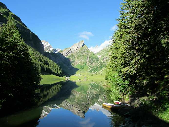 Sobald das erste Felsband überwunden ist, folgt der manchmal etwas ausgesetzte, aber gesicherte Weg der Höhe nach Südwesten und erklimmt eine Hochfläche, die letztlich zur Meglisalp führt. Diese lädt zu einer ersten, eindrücklichen Rast. Der Ausblick hinunter zum Seealpsee ist grandios, aber die Bergwelt rundherum ist mindestens genauso, wenn nicht sogar berauschender.