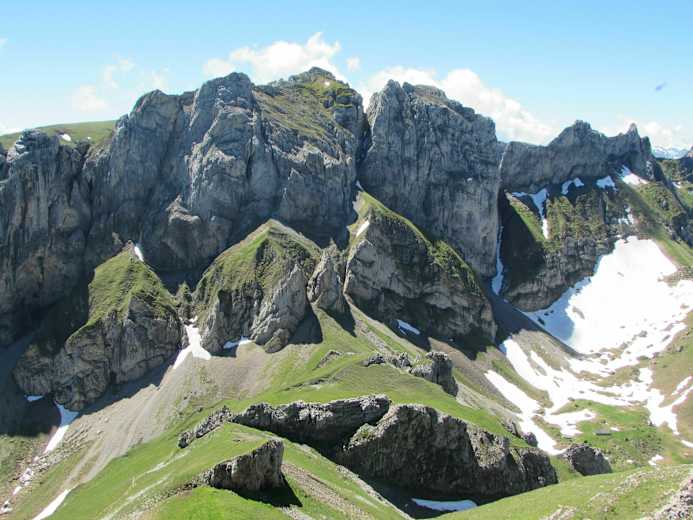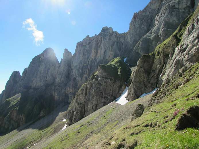 Von Meglisalp folgt man der weiss-roten Markierung nach Süden und dann wieder nach Osten, stetig hinauf zum Widderalpsattel (1.855 m). Im Schatten von Hundstein & Co können hier im Frühsommer durchaus noch Altschneefelder liegen. Am Widderalpsattel sieht man dann eine weiss-blaue Markierung für den Pfad zum Hundstein.