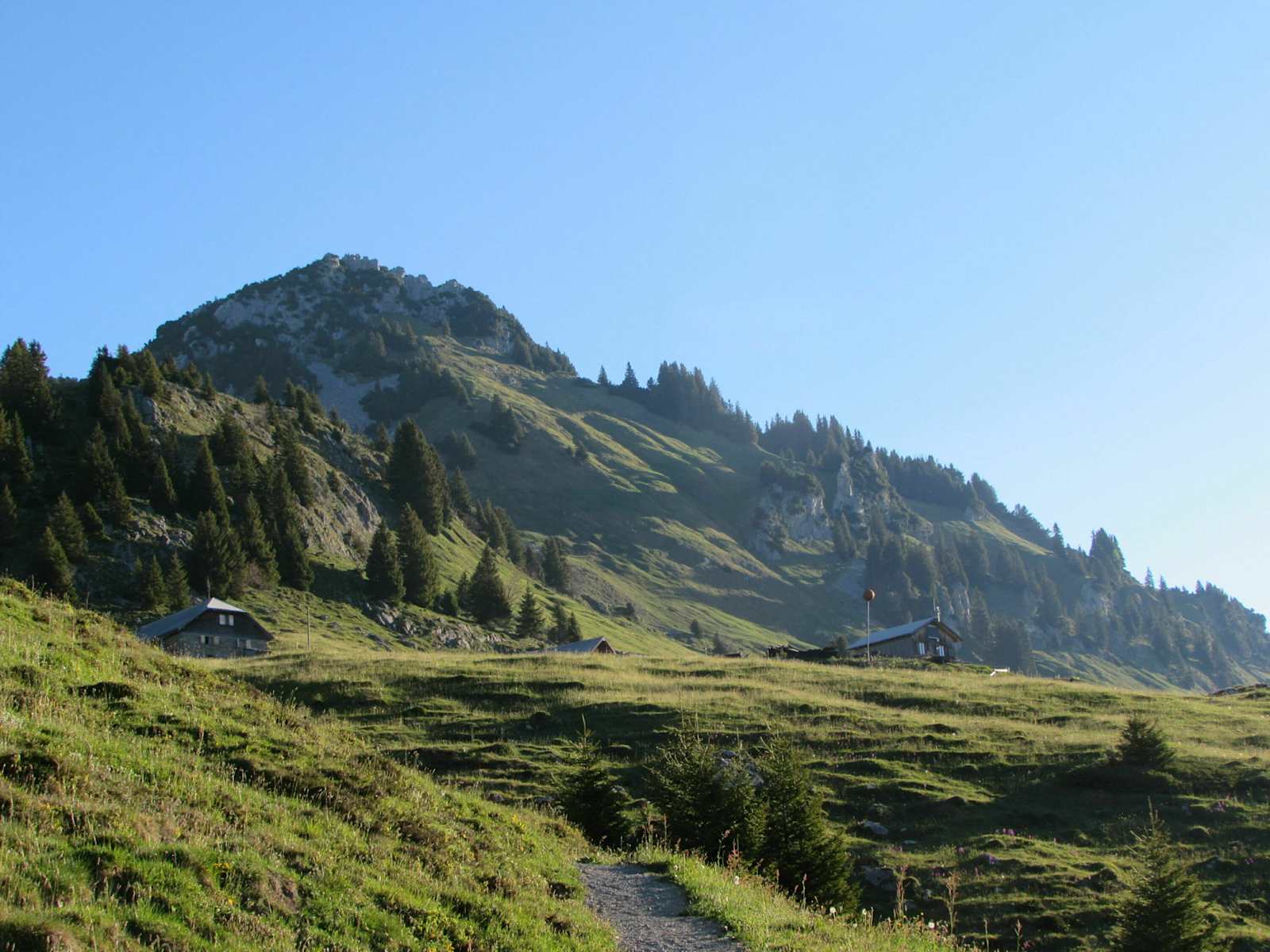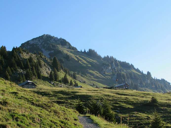 An einem heißen Tag lohnt es sich, früh zu starten. Der Dunst liegt noch über dem Tal, die Sonne wird bald im Osten über den Churfirsten aufgehen. Die ersten Aufwärmmeter verlaufen durch das Dorf Amden (910 m). Der Weg, selten Asphalt, meist Kies, verläuft stets auf der rechten (westlichen) Seite des Sessellifts. Bald verengt sich der Pfad und man marschiert durch Kuhwiesen stetig hoch zur Bergstation des Sessellifts. Hier bietet sich eine kurze Rast an - für den schönen Blick über den Walensee und Amden.