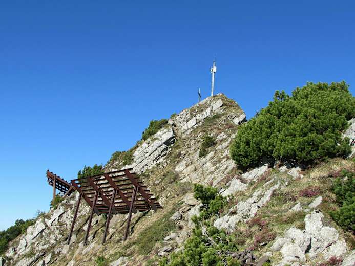 Der Hang ist steil, auf dem serpentinenartigen Weg fällt das Steigen jedoch leicht. Kurz unter dem finalen Grat erreicht man ein kleines Häuschen, welches als oberes Ende einer alten Materialseilbahn dient. Die Aussicht ist prächtig, aber der nahe Gipfel verleitet uns doch, weiterzugehen.
