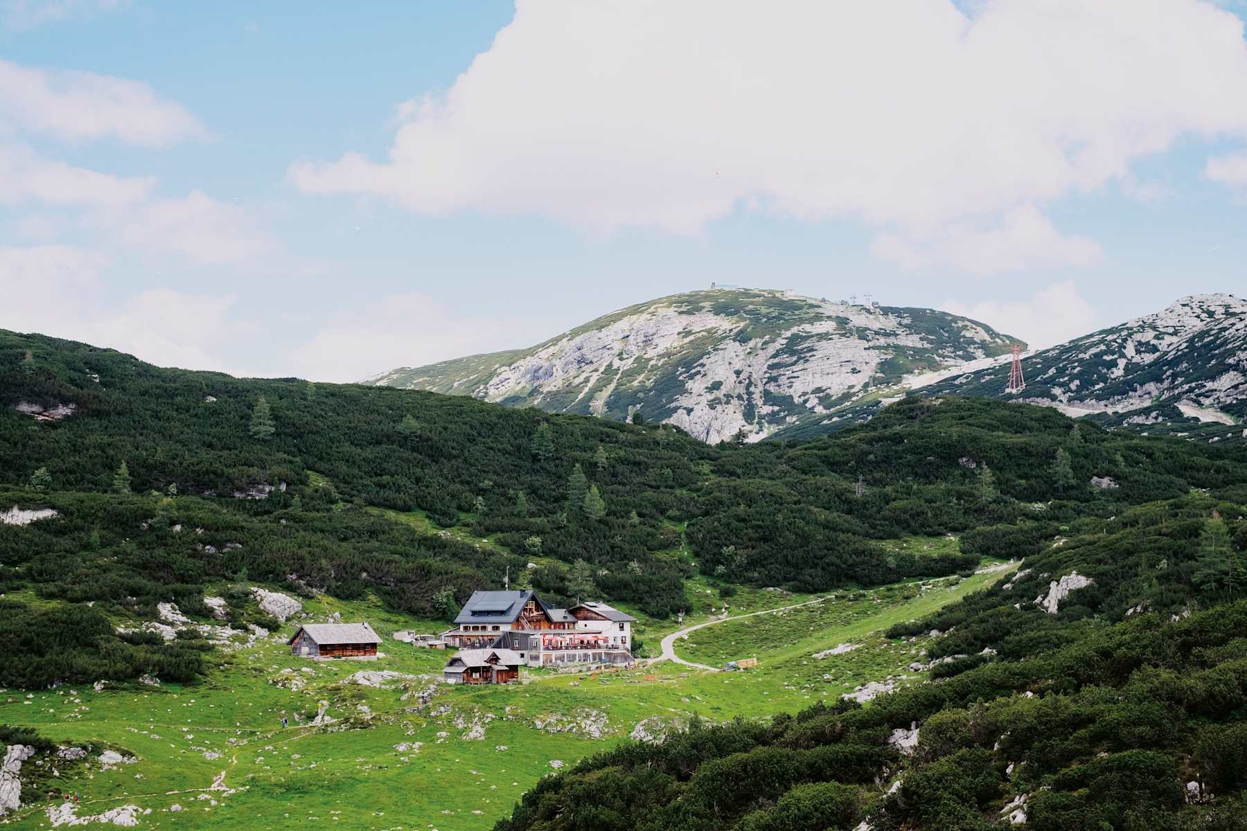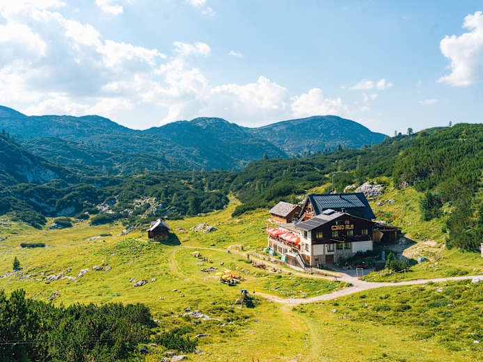 Im Salzkammergut in Oberösterreich, auf dem einzigartigen Dachsteinplateau steht die Gjaid Alm auf 1.738 m Seehöhe. Man erreicht sie am schnellsten mit der Seilbahn von Obertraun. Von der Bergstation der Dachstein-Krippenstein-Seilbahn sind es nur noch 10 Minuten Gehzeit. Wer den Hüttenbesuch mit einer schönen Wanderung verbinden will, kann den Abstieg von der zweiten Station der Krippensteinbahn, dem Krippensteingipfel auf 2.108 m Seehöhe nehmen. Von hier aus gelangt man über die Skispiste hinunter zur Gjaid Alm.