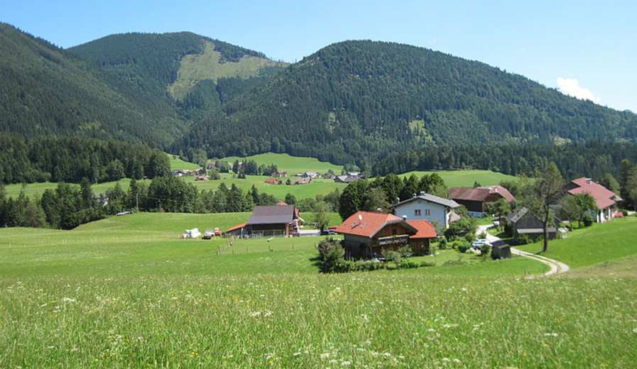 Folgt man dem BergeSeenTrail weiter, geht man geradeaus zur Landstraße, hält sich rechts und zweigt nach rund 800 m links ab. Anfangs geht es ein Stück bergab, dann jedoch etwas länger aufwärts zur Ortschaft Hamoosau. Vorbei an einer Kapelle, später bergab durch den Wald zum Gehöft Rafft und schließlich wandert man ein Stück auf einer Asphaltstraße bis zur Kehre.