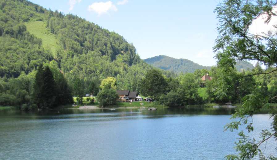 Entlang des Sees wandert man links weiter bis zu einem Gehöft. Dort hält man sich links aufwärts zur Straße, über eine Brücke und dann wieder rechts durch den Wald zum Südende des Sees.