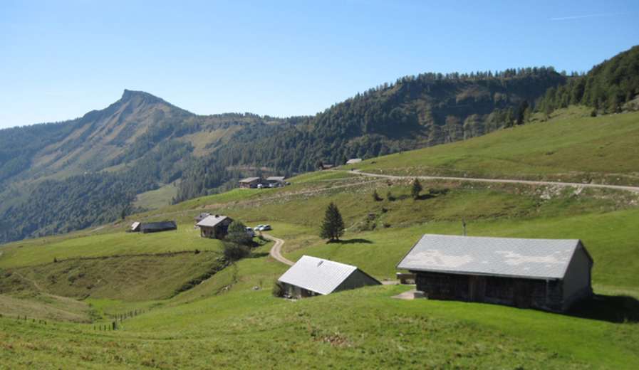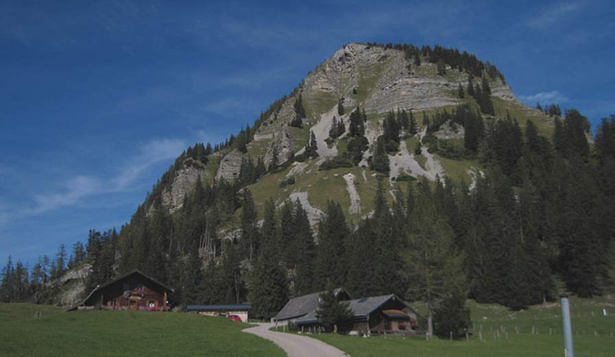 Schließlich erreicht man den Sattel zwischen Osterhorn und dem Pitscherberg. Entlang eines schmalen Steiges geht es bergauf durch den Bergwald bis zu einem Wegweiser unterhalb des Gipfels des Pitscherberges. Abwärts über die Wiesen und durch den lichten Lärchenwald gelangt man zur netten Pitschenbergalm, die nicht nur einen schönen Blick auf den Dachstein bietet, sondern auch zur Einkehr einlädt.