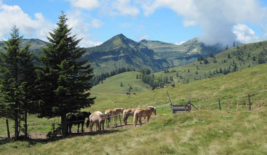 Über eine Almwiese geht es rechts abwärts weiter, man passiert ein Weidetor am Waldrand und wandert flach durch den Wald zu einem Sattel. Es folgt ein etwas steileres Stück, eine sumpfige Stelle wird mittels Holzsteg gut überwunden. Schließlich erreicht man die Schartenalm auf 1.051 m, die allerdings nicht bewirtschaftet ist.