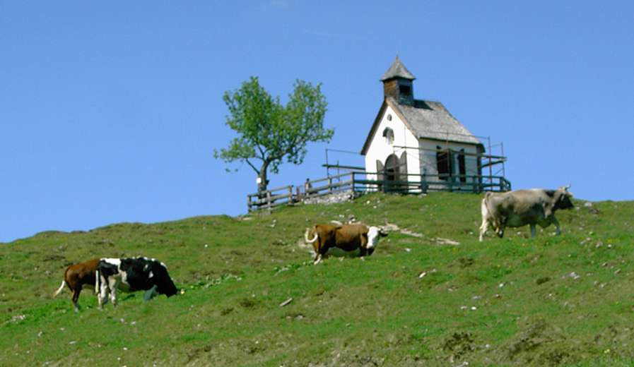 Vom Sattel geht es auf schmalem Almweg hinunter zur privaten Höplihütte und weiter durch lichten Lärchenwald hinab zur obersten Hütte der Niedergadenalm, die auf 1.228 m steht.