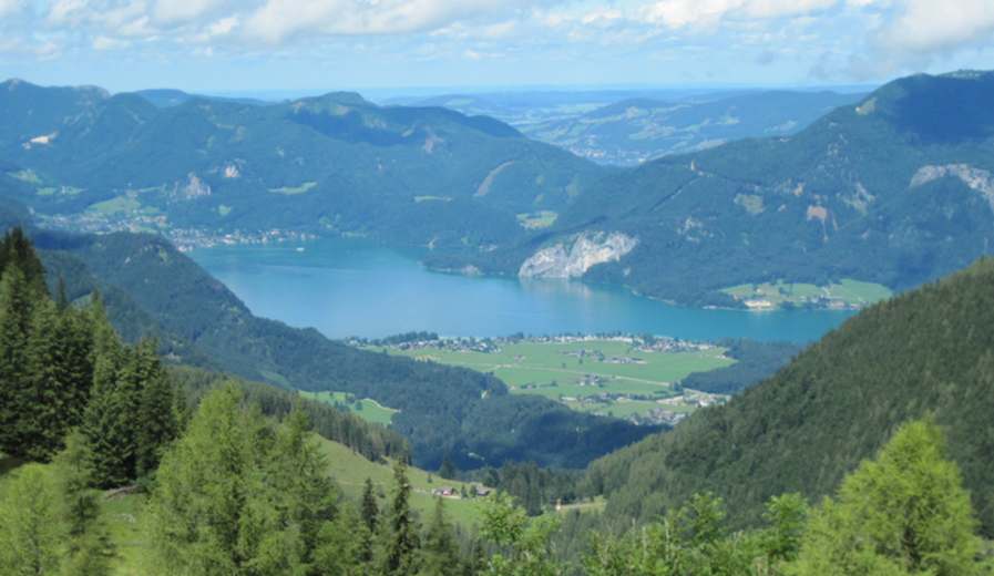 Im Norden der Blick auf den Schafberg mit Wolfgangsee, Mondsee und Irrsee und auch vom Attersee ist ein kleines Stück sichtbar. Im Süden überwältigt der Ausblick auf das Postalm-Plateau, dahinter ist das Gamsfeld und das Tennengebirge zu erkennen.