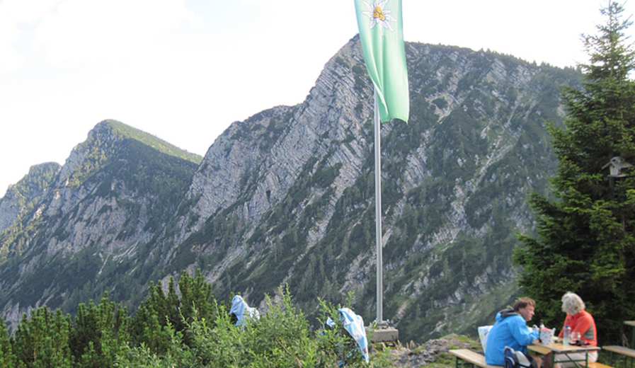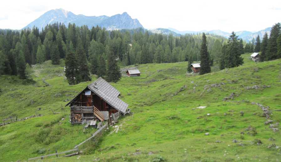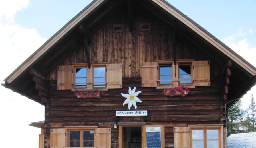 Mäßig steil geht es weiter aufwärts zu den ersten Hütten der Schartenalm und dann links flach über Almwiesen zur Goiserer Hütte auf 1.592 m, die auf einem sehr schönen Aussichtspunkt errichtet wurde.