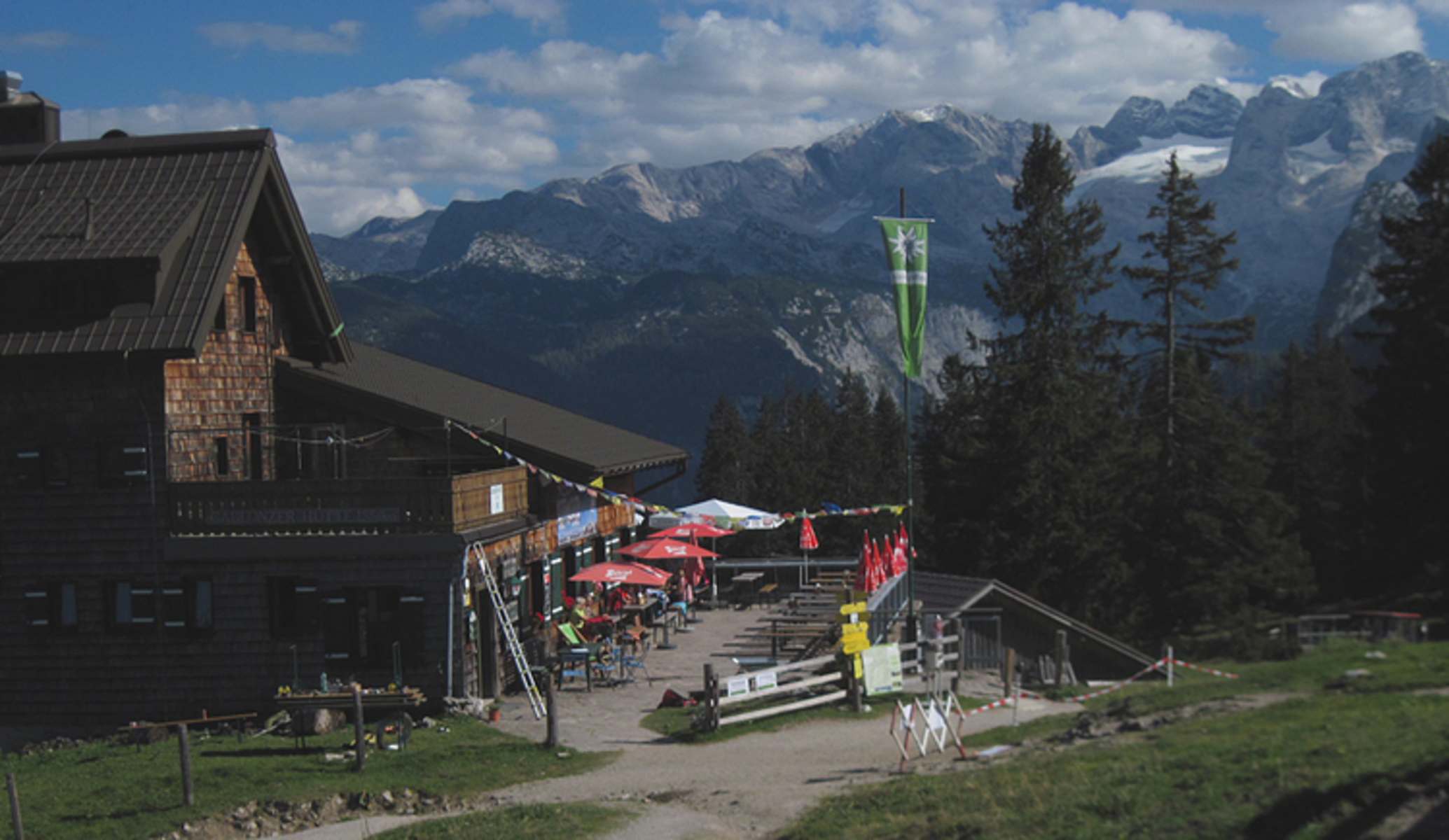 Rechts zweigt ein Steig zur Mittelstation der Hornspitzlifte ab und flach gelangt man zur Falmbergalm. Weiter auf einem Forstweg, bis der Steig wieder rechts abzweigt. Auf diesem erreicht man schließlich den höchsten Punkt dieser Etappe, die Gablonzer Hütte auf 1.550 m, die zur Einkehr einlädt und eine wunderbare Sicht auf die wilden Zacken des Gosaukammes bietet. Unten sieht man den Gosausee und im Hintergrund wohl einen der schönsten Talschlüsse der Alpen mit dem Dachstein.