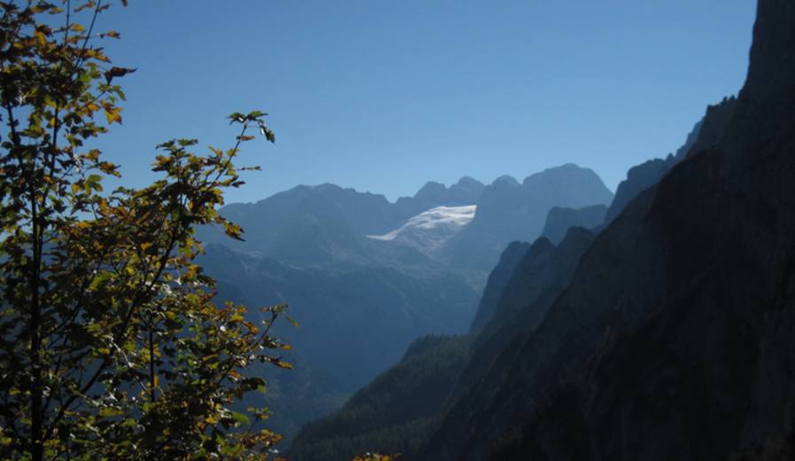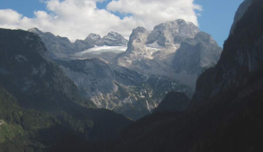Gleich unterhalb der Goiserer Hütte führt ein Weg hinunter nach Gosau. Anfangs geht es flach über das Almgelände abwärts, bei den Hütten der Schartenalm vorbei und zu einem Wegweiser. Weiter gerade aus erreicht man eine Forststraße, der man für rund 1 km folgt. Dabei genießt man die schöne Aussicht auf das Dachsteinmassiv.
