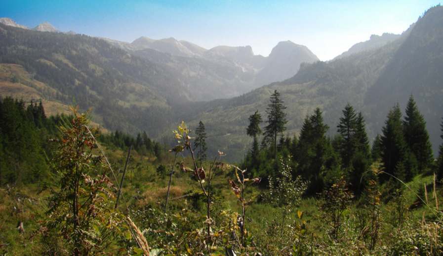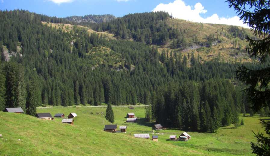Vom Öderntörl folgt man einem schmaler Steig durch lichten Wald abwärts zu den ersten Hütten der Ödernalm, die auf rund 1.250 m liegen.
