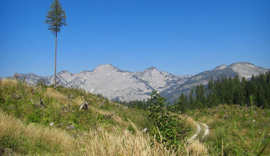 Einer Forststraße entlang der Salza folgend, geht es talauswärts. Nach rund 4 km erreicht man den sogenannten Rechenplatz, wo man sich rechts hält. Nach weiteren 250 m talauswärts, folgt man einer rechts abzweigenden Forststraße leicht aufwärts. In einem Bogen gelangt man zum Ende der Straße und zum Wanderweg, der von Bad Mitterndorf herauf führt. Auf diesem Almweg rechts ansteigend erreicht man in 20 Minuten die Schneckenalm.