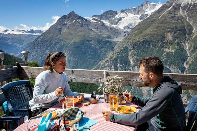 Die hölzerne, auf Stelzen erbaute (1999) moderne Hütte vereint Hüttenflair, tolle Terrasse, bunten Lärchenwald und Top-Ausblick zum Weisshorn und ins Mattertal.