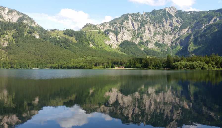 Entlang der Straße erreicht man bald darauf den Gasthof Seehaus. Ein idyllischer Wanderweg führt von hier weiter am östlichen Ufer des stillen Almsees. Die kleinen verträumten Buchten und der Blick auf die Berge im Süden verleihen dem Weg eine sehr romantische Note.