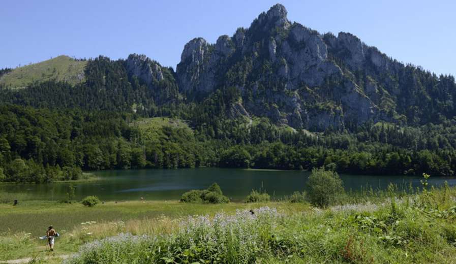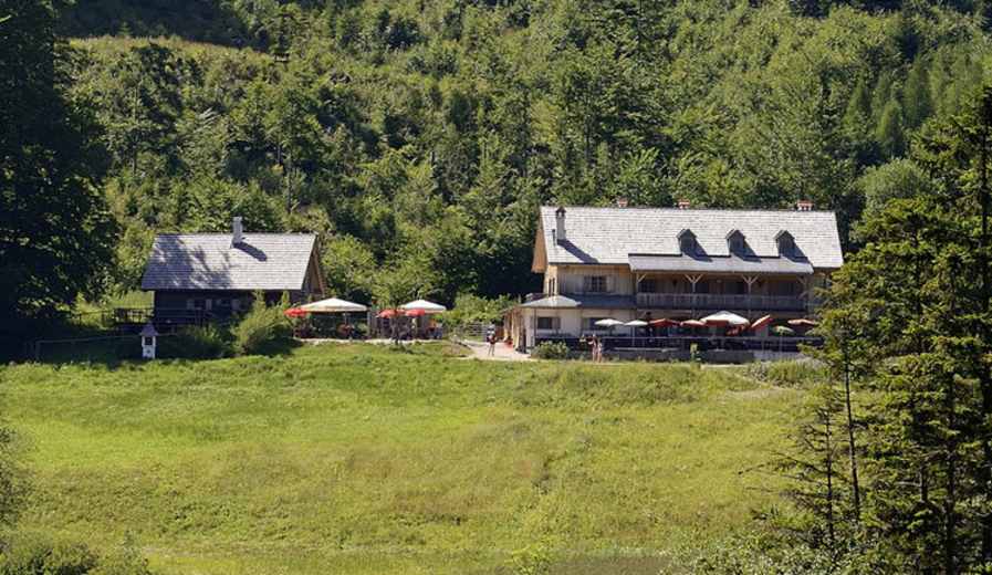 Vom Jagdhaus wandert man weiter nach Westen, anfangs auf einem Fußweg, der die Kehren der Forststraße abkürzt, und später wieder auf der Straße bis zur nächsten Gabelung. Man hält sich links und gelangt so anfangs flach, dann leicht abwärts zum wunderschön gelegenen Laudachsee auf 894 m.