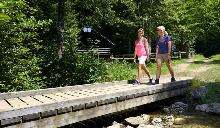Vom Tourismusbüro in Grünau folgt man ein kurzes Stück der Gemeindestraße talauswärts, bis links der Flößerweg über die Grünaubachbrücke führt. Nach rund 300 m quert man den Fluss über einen Steg.