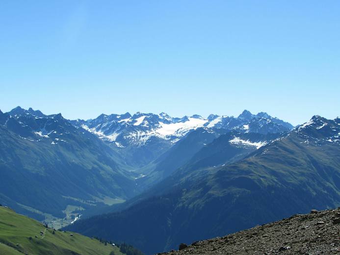 Ab der Parsennhütte, die sich auch zur kurzen Rast anbietet, ist man nun vollends im Davoser Skigebiet. Liftanlagen verbinden jede Anhöhe miteinander. Der Weg, nun eine Trasse in einer alpinen Wüste ohne Bewuchs, erklimmt mal flach, mal steil diese Anhöhen in Richtung Weissfluh. Der Berg wird erst recht spät sichtbar, ungefähr ab dem Totalpsee, einem künstlich aufgestautem Becken, welcher im Winter für den Kunstschneeeinsatz als Reservoir dient. Ab dieser Höhe sind die Fernblicke beeindruckend, vor allem der Silvrettagletscher glänzt in nordöstlicher Richtung.