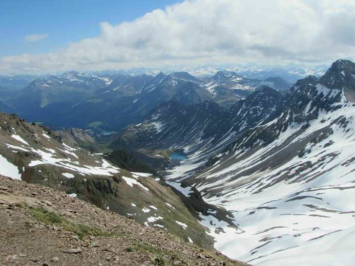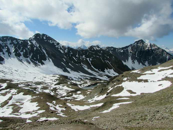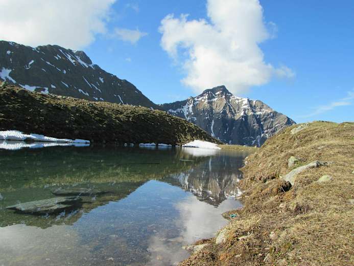 Von der Alp Sanaspans geht es zunächst etwas abwärts zum Bachbett, nach der Querung stetig aufwärts auf einem schmalen Pfad in wunderschöner, alpiner Landschaft. Das Lenzer Horn und das Aroser Rothorn prägen die Bergsilhouette. Am kleinen, aber wunderschönen Lai Plang Bi kann die nächste, kurze Pause eingelegt werden, bevor es (im Frühjahr über Altschnee) in einem Linksbogen auf ein Jöchlein über der Hochebene von Plang Bi geht.