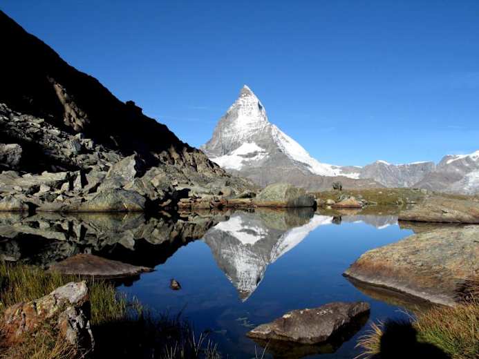 Eine leichte, familienfreundliche Wanderung mit wunderschöner Matterhornspiegelung führt einen von der Station Rotenboden zum Riffelsee (2.757 m) bei Zermatt in Wallis. Die kurze Tour durch reiche Alpenflora vorbei an den Wandabbrüchen des Riffelhorns (Klettersteig) kann man mit einer gemütlichen Einkehr bei der Station Riffelberg beenden.