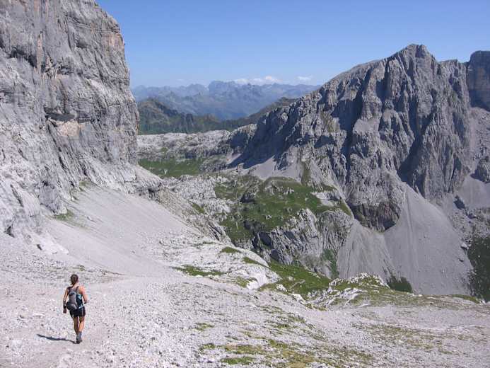 Der Tag zur Sulzfluh führt durch typische Rätikon-Landschaften. Am eindrücklichsten sind die baren Kalkfelsen, denen man aber erst ab dem Einstieg ins Gemschtobel begegnen. Zuvor durchsteigt man in vielen Windungen saftig grüne Alplandschaften.