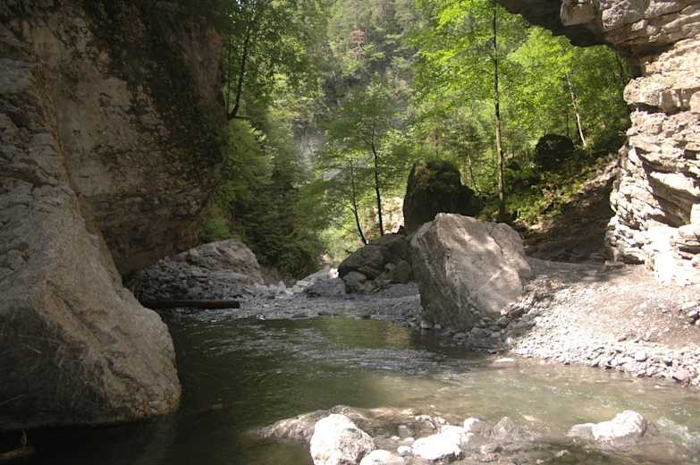 Ab hier geht es direkt hinunter zum Wasser und man folgt dem Flusslauf aufwärts. Je nach Wasserstand sucht man sich den Weg durch und über die Frödisch - man wird nass - auf jeden Fall. Aus diesem Grund sind leichte Bergsandalen (ohne Socken) die beste Ausrüstung.