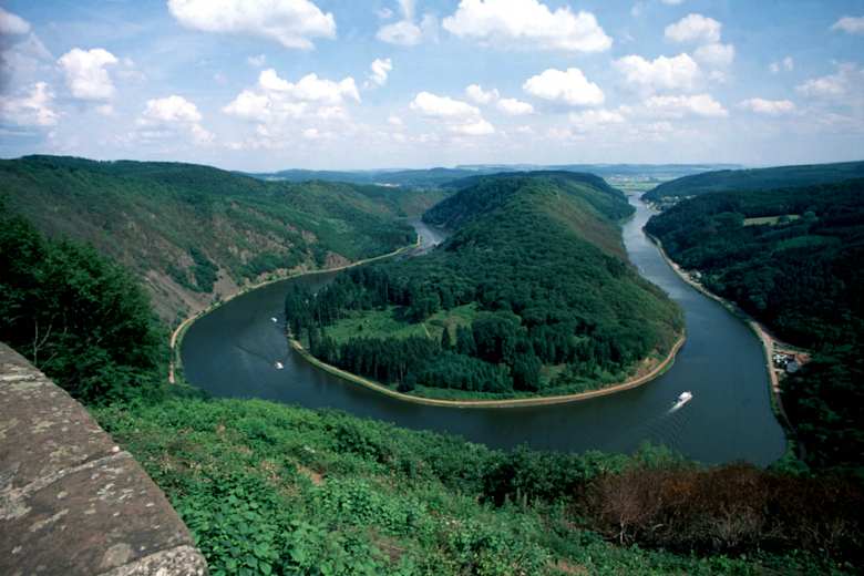 Atemberaubend ist der Blick vom Aussichtspunkt Cloef auf die Saarschleife. Der Premiumwanderweg Tafeltour führt von Mettlach im Saarland, dem kleinsten deutschen Bundesland, durch das Steinbachtal zum Aussichtspunkt. Spektakuläre Pfade und bequeme Waldwege bilden diesen abwechslungsreichen Steig, an dem die Saar sogar auf einer Fähre überquert wird.