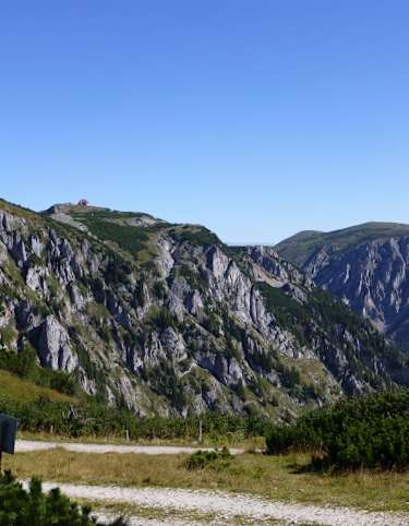 Der familienfreundliche Weg zum Otto-Haus (1.650 m) von der Bergstation der Rax Seilbahn ist einfach, kurz und flach. Man erreicht das Schutzhaus in einer halben Stunde und legt rund 2 km und 100 Höhenmeter zurück.