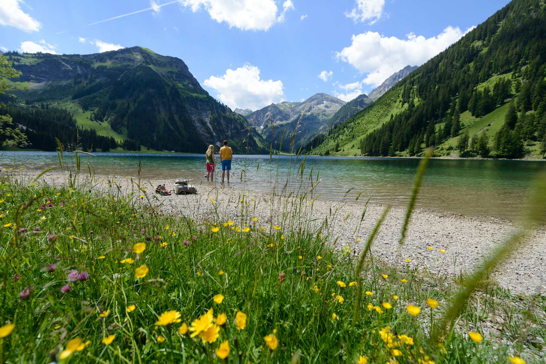 Eine einfache Wanderung führt am rechten Ufer des wunderschönen Vilsalpsee im Tannheimer Tal in Tirol zur Vilsalpe. Der See, umrahmt von den Allgäuer und Lechtaler Alpen, eignet sich im Sommer auch für ein Bad nach einer längeren Bergtour.