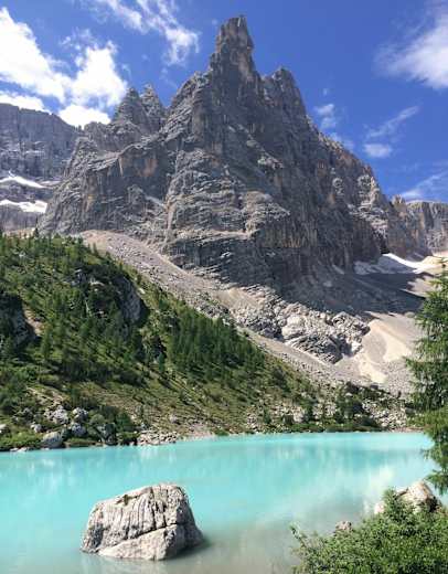 Von hier aus wandert man zum nahe gelegenen Lago di Sorapiss. Der milchig-türkisgrüne Bergsee mit weißem Sandstrand fasziniert nicht nur durch seine Farbe, sondern auch durch seine herrliche Lage inmitten dieser surrealen Bergwelt. Nördlich des Sees sieht man die Punta Sorapiss (3.205 m), die Tre Sorelle (3.005 m) und den Dito di Dio (2603 m).