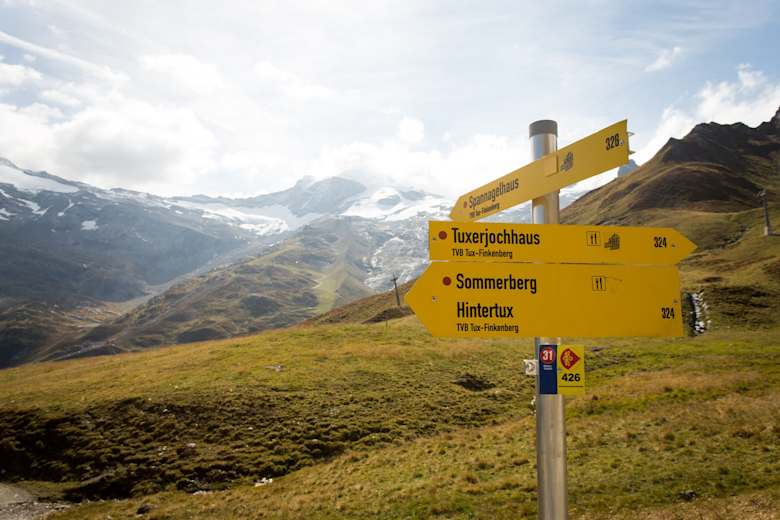 Wegweiser auf dem Weg zum Tuxerjochhaus Foto: Marco Rossi, Bergwelten Zillertal-Magazin, 01/2015