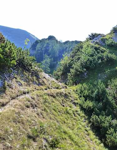 Entlang von einigen Kehren überwindet man 300 Hm am Graf-Meran Steig und ist dann schon fast am Ziel. Bei der Wegkreuzung nordseits des Rotangkogels, am Ende des Graf-Meran Steigs, sind es noch weniger als 1 km Wegstrecke und 100 hm bis zum Schiestlhaus.