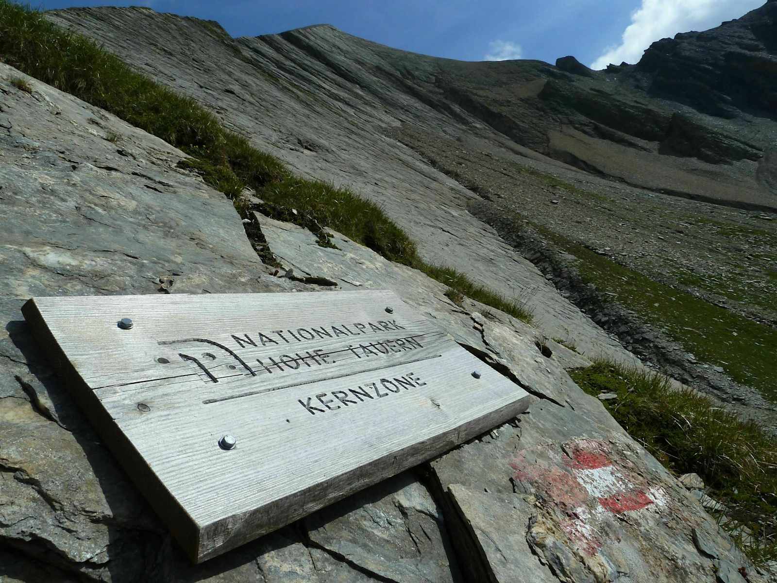 Unterhalb der Glatzschneid teilt sich der Weg noch einmal: geradeaus führt er zur Glorerhütte, links zur Salmhütte. Ein Stück oberhalb weist ein Holzschild auf einem Felsen darauf hin, dass man nun die Kernzone des Nationalparks Hohe Tauern betritt.