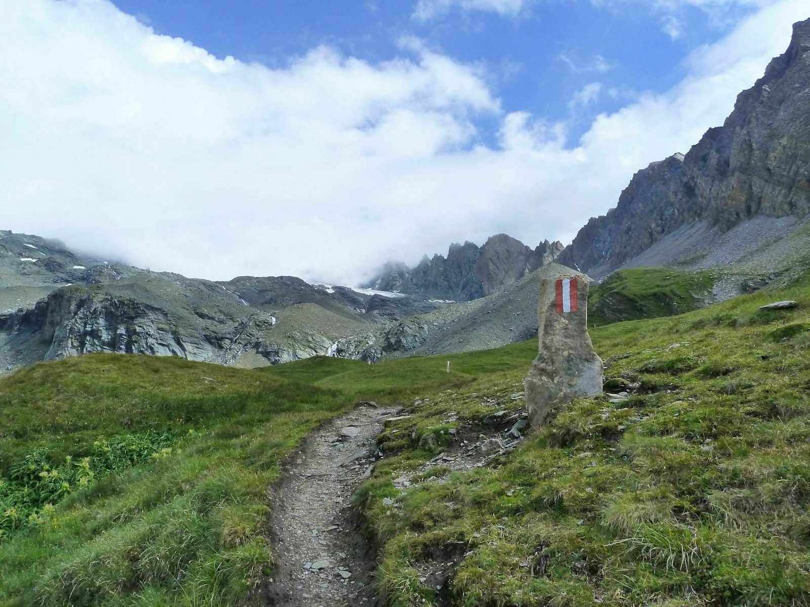 Senkrecht aufgestellte Steinplatten mit rot-weiß-roter Markierung weisen den Weg in den kleinen ebenen Boden, von dem aus der Weg zur Salmhütte über die Pfortscharte rechts abzweigt. Man folgt diesem nun wieder ein wenig talauswärts, kehrt dem Glockner also den Rücken. Einige wenige Passagen sind seilversichert.
