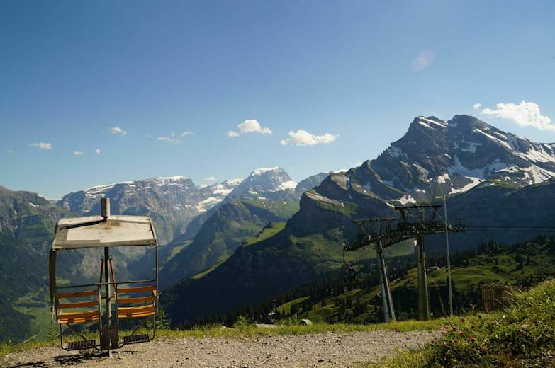 Von der Bergstation Grotzenbüel (1.559 m) führt der leicht ansteigende Weg in einer knappen Stunde zum Kneugrat, wo man einen herrlichen Blick auf das Bächital und die Glarner Alpen geniesst.