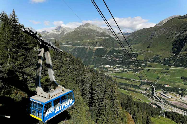 Mit der Seilbahn von Airolo erreicht man bequem Pesciüm (1.727 m) und startet diese Wanderung sogleich in Richtung Restaurant Alpe Pesciüm. Auf der gegenüberliegenden Talseite ist klar die Tremola erkennbar. Die alte Pass- und Serpentinenstrasse über den Gotthard.