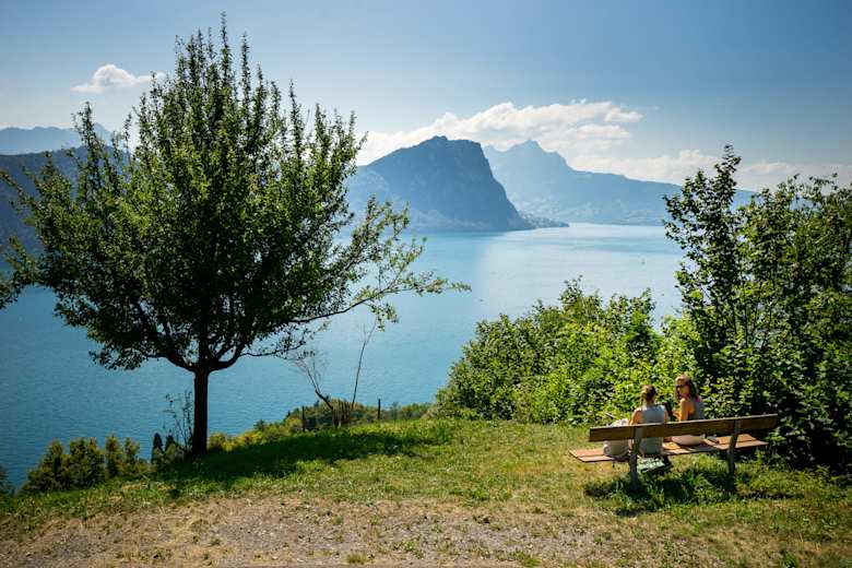 Dann geht es auf 770 m hinauf und bis an die steile Hangkannte heran, bevor man durch den Lützelauerwald nach Bodenberg absteigt. Über den Rigiblick oberhalb von Weggis geht es hinaus auf die Landzunge und ganz nah am Steilufer des Sees entlang.