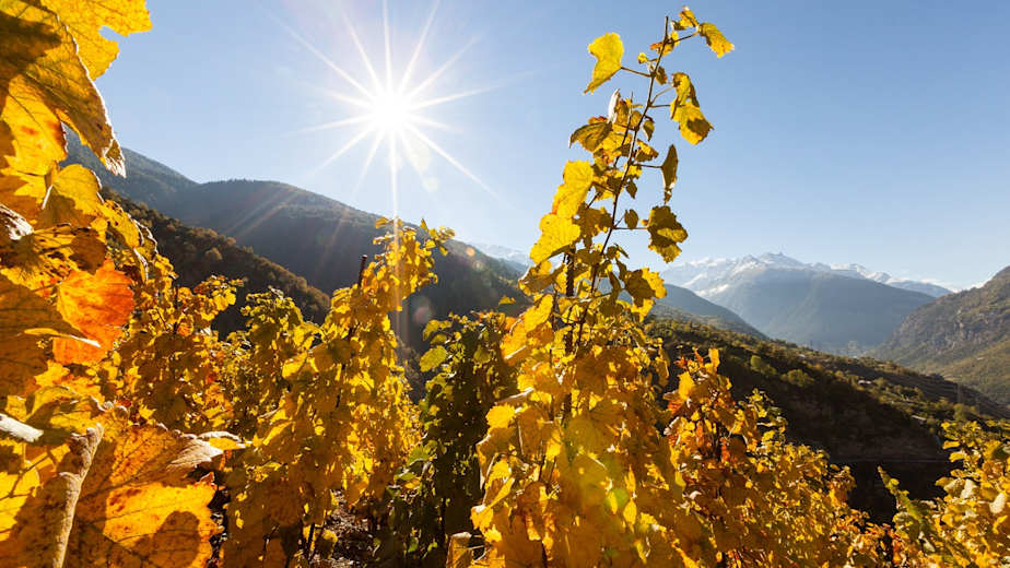 Die Wanderung von der Bergstation der Seilbahn auf den Gspon oberhalb von Stalden im Bezirk Visp im deutschsprachigen Teil des Kantons Wallis hinunter nach Visperterminen führt über Europas höchstgelegenen Weinberg mit wunderbarem Panorama.