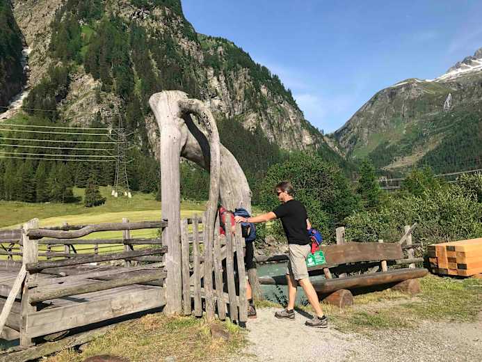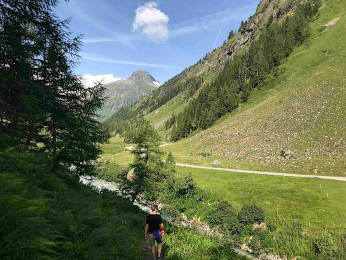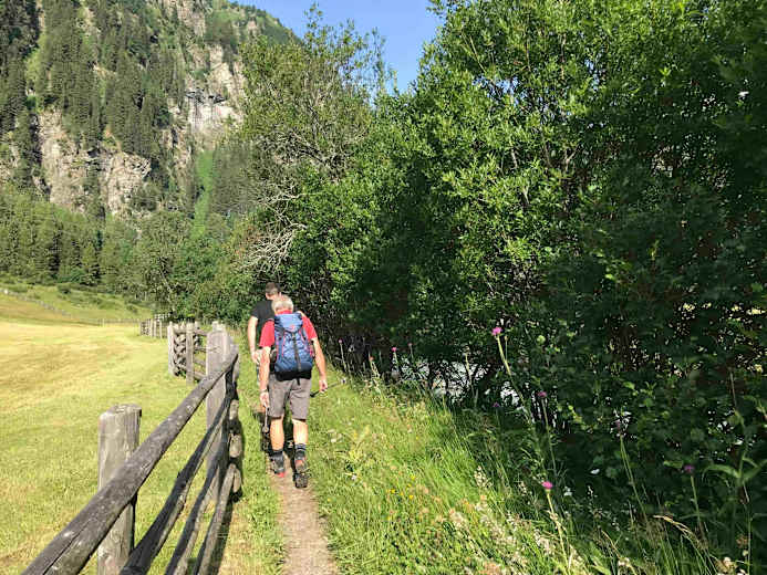 Vom großen Wanderparkplatz beim Matreier Tauernhaus wandert man entlang der Straße taleinwärts. Schon bald kann man links durch ein Tor und über die Brücke auf den Wanderweg auf der linken Bachseite wechseln. Anfangs über die Wiesen, später durch den Wald geht es über mehrere Geländestufen aufwärts.