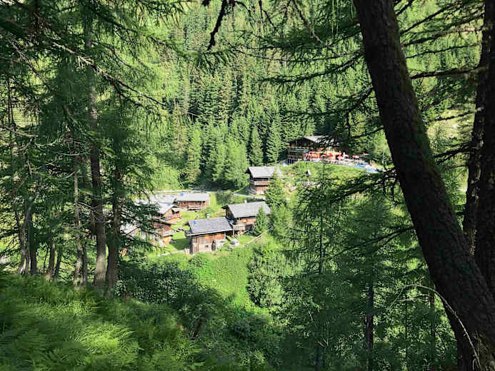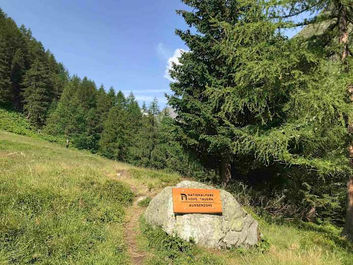 Schließlich erreicht man das Schild mit dem Hinweis, dass man sich nun in der Außenzone des Nationalparks Hohe Tauern befindet. Hier geht es nun leicht abwärts, durch die Bäume hindurch sieht man auf Außergschlöss mit den schönen, alten Holzhäusern.