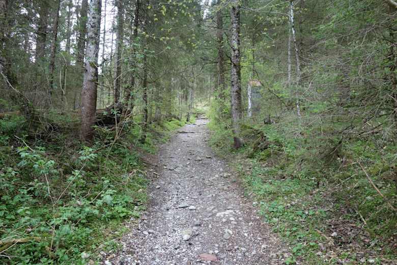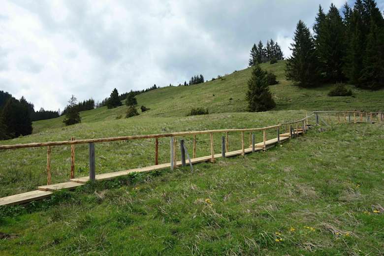 Vom Nesselwang Explorer Hotel über eine Holzbrücke und dann links dem Kreuzweg Richtung Maria Trost und weiter zur Kappler Alm. Hier ist der höchste Punkt der Tour erreicht.