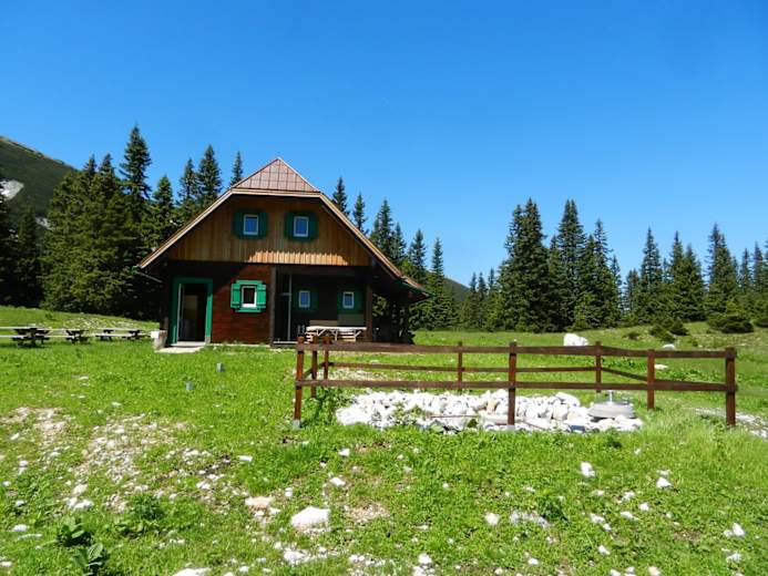 Am Klobentörl, dem mit 1.654 m höchsten Punkt der Wanderung, hält mach sich gerade aus und folgt der Beschilderung der zur Gloggnitzerhütte, die man wenig später in leichtem Abwärtsgang erreicht.