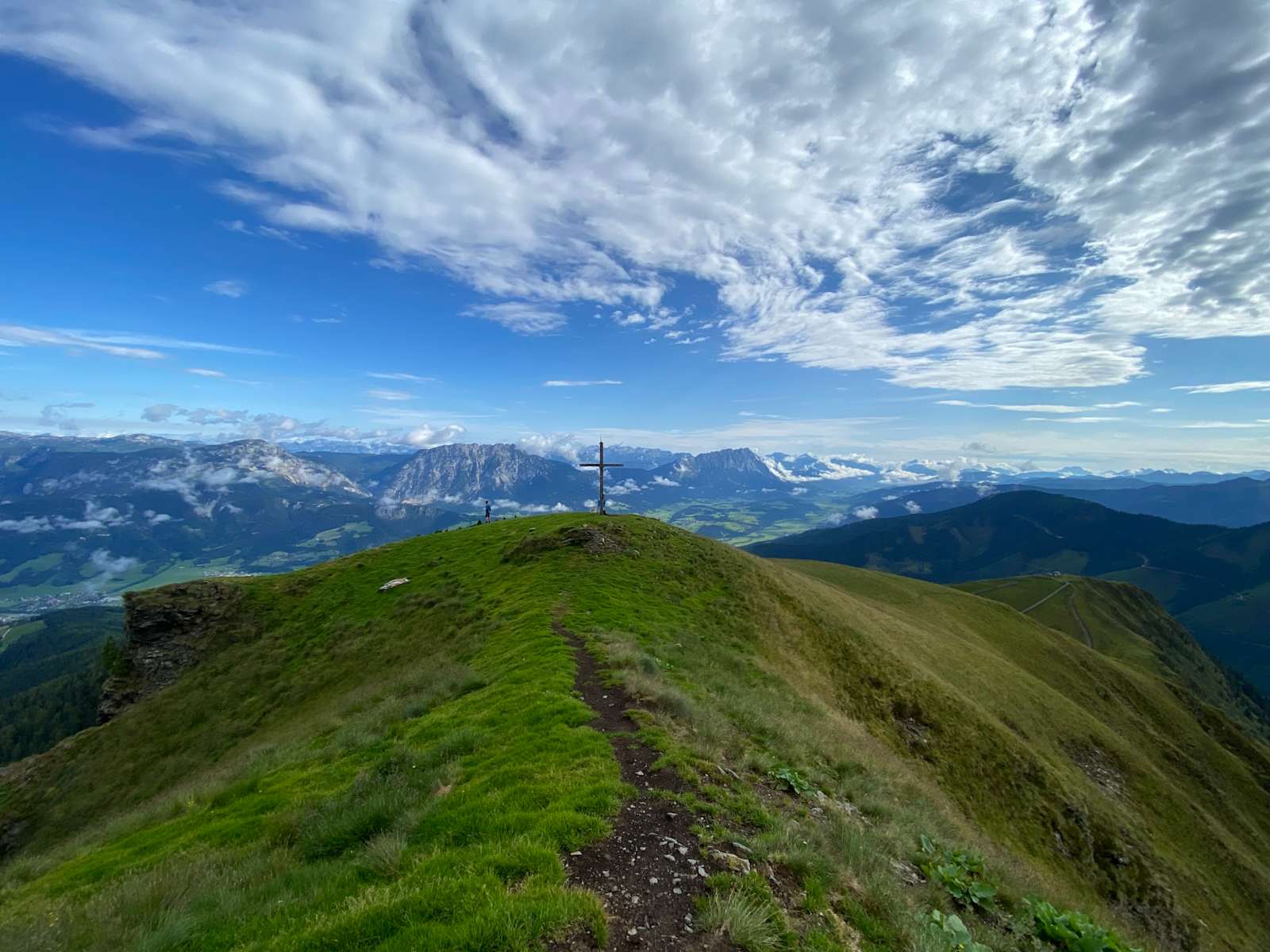 Über das freie Almgelände mit schöner Aussicht ins Ennstal geht es schließlich nur Pleschnitzzinkenhütte auf 1.927 m, die ihren Namen von Pleschnitzzinken hat, der direkt südlich der Hütte steht.