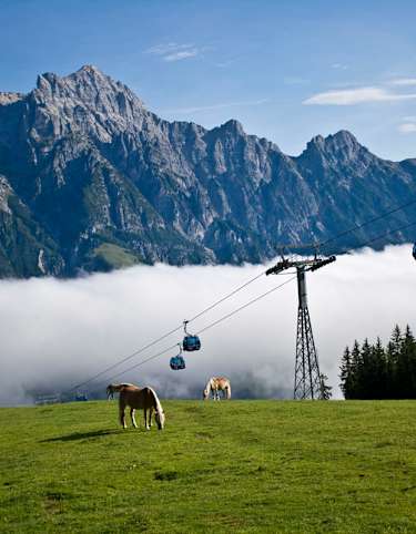Oben angekommen, wartet ein eindrucksvolles Panorama: Der Blick reicht über das Saalfeldener Becken, das Kitzsteinhorn bis hin zu den Leoganger Steinbergen.