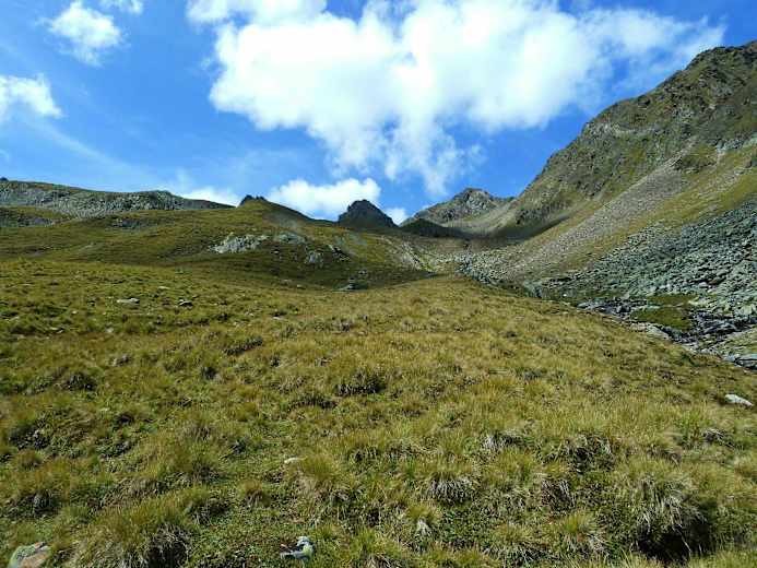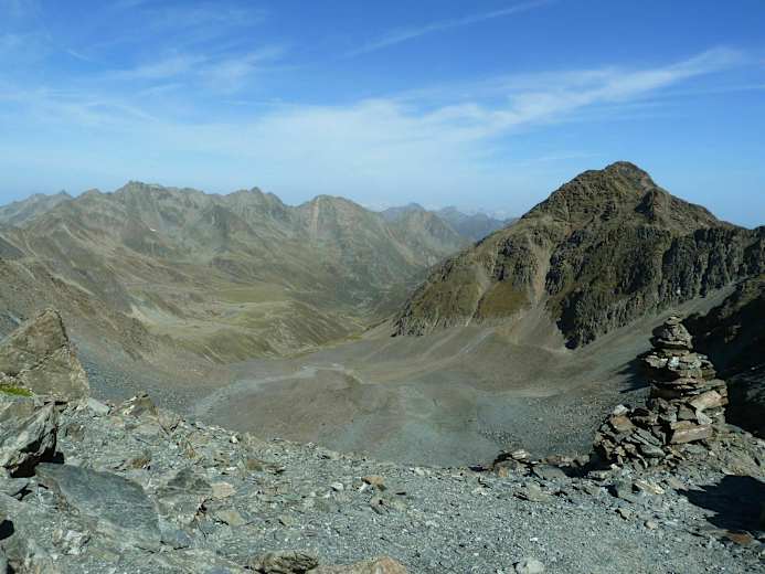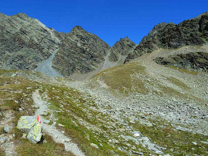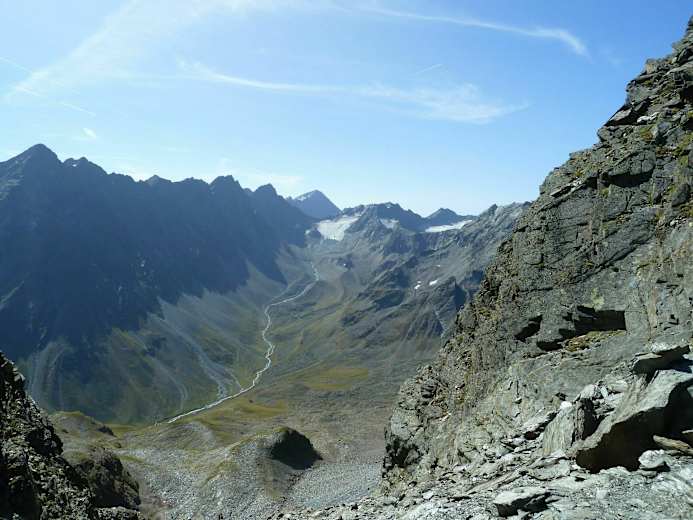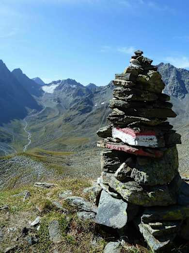 Weiter auf dem Steig aufwärts, vorbei an Steinmännchen, gelangt man zur Abzweigung des Praxmarer Höhenweges nach rechts. Will man auf die Schöntalspitze, folgt man aber dem Steig gerade aus. Über Blockgestein nähert man sich dem letzten steilen Anstieg durch das Geröll aufwärts. Schweißtreibend kämpft man sich nach oben, bis man die Scharte auf rund 2.950 m erreicht. Die Aussicht von hier ist schon grandios, vor allem hinein ins Gleirschtal - als wäre man in Nepal!