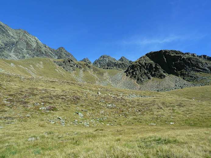 Rechts oberhalb der Hütte folgt man der Beschilderung zur Münsterhöhe und zur Pforzheimerhütte, die hier ebenfalls schon angeschrieben ist. Schließlich stell die Zischgenscharte einen wichtigen Übergang ins Gleirschtal dar. Schnell gewinnt man auf dem Steig an Höhenmeter. Auf der Münsterhöhe - der kleine Abstecher von wenigen Metern lohnt sich - steht ein Kreuz und eine Bank und man genießt einen wunderbaren Blick.