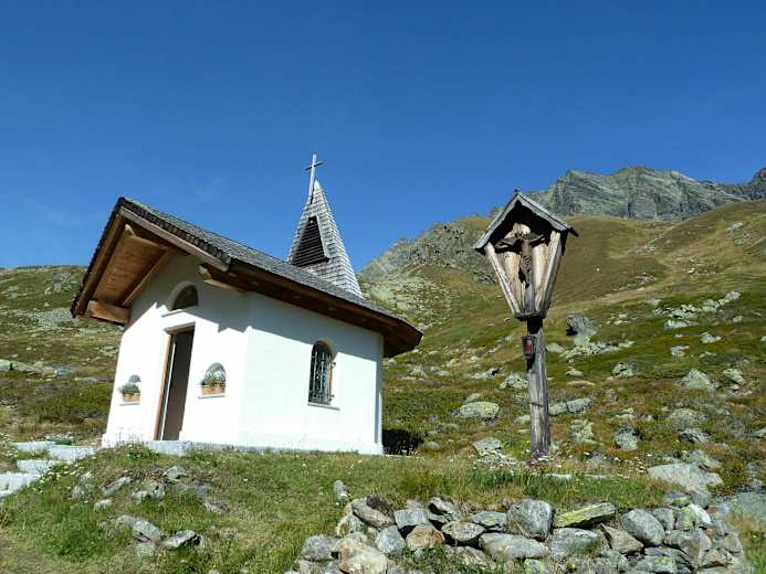 Nach rund 2:30 h erreicht man das Westfalenhaus auf 2.272 m. Die kleine Kapelle vor dem Haus ist ein beliebtes Fotomotiv vor dem Hintergrund des Längentalferners.