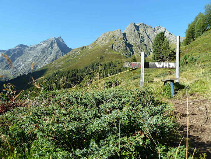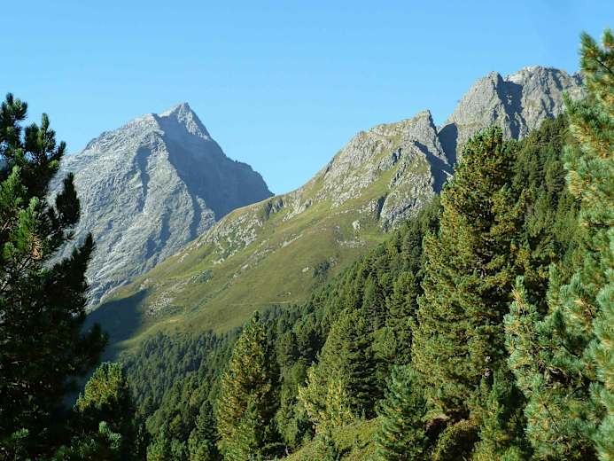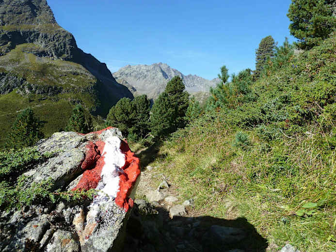 Vom Parkplatz in Praxmar geht man bis zum Ende des Platzes und folgt dann der Beschilderung zum Westfalenhaus. Ein Steig führt nach rechts oben und in leichtem Auf und Ab durch den Zirbenwald taleinwärts. Schon bald lichtet sich der Wald und man genießt erste geniale Blicke auf den Lüsener Fernerkogel, der den Talschluss dominiert.