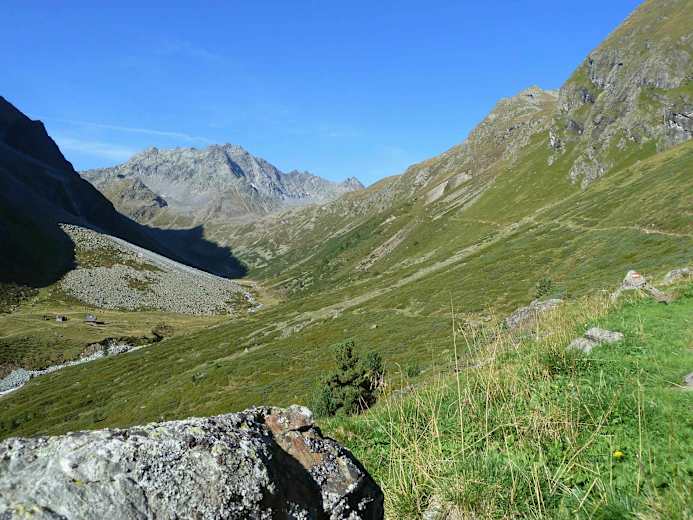 Schließlich trifft man auf den Weg, der von Lüsens herauf führt. Über den Sommerweg geht es nun hinein ins Längental, weit oberhalb des Baches. Die Sicht ins Tal und die hoch aufragenden Berge, einerseits zur Linken der Lüsener Fernerkogel und die Villerspitze, aber später auch hinein zum Seeblaskogel werden immer besser. Der Wanderweg zieht am Hang entlang, unten neben dem Längentalbach sieht man den Winterweg, und ganz weit hinten kann man bereits das Westfalenhaus ausmachen. Zwei rot-weiß-rote Seilbahnstüzten der Materialseilbahn stören das Gesamtbild nur wenig.