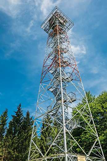 Man überquert die Militärstraße und geht geradeaus bis zu einer quer verlaufenden Straße. Hier zweigt man nach rechts ab und spaziert hinüber zum Aussichtsturm Hursch. Man besteigt den Turm und genießt die weite Rundsicht.