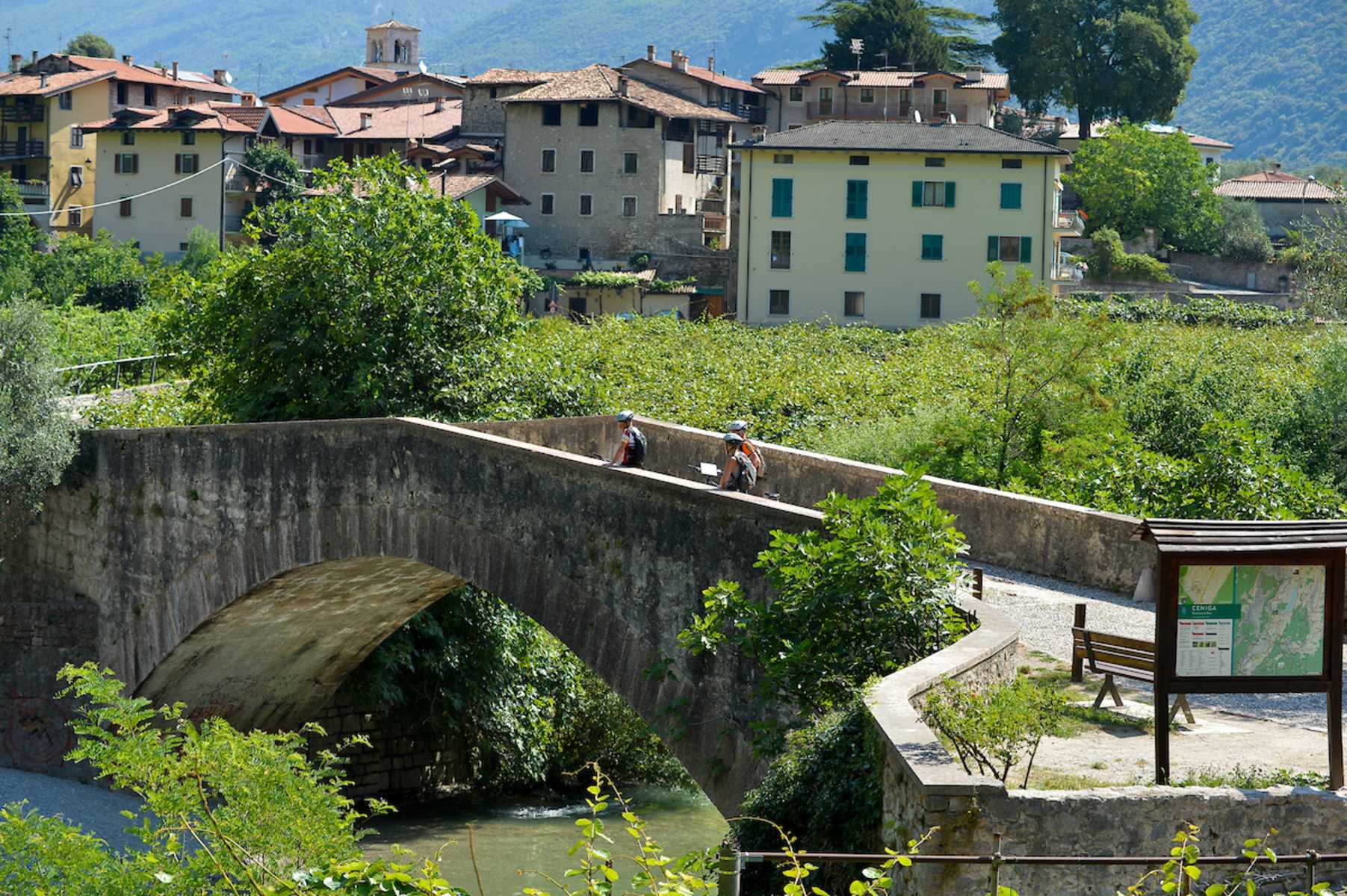 Unbedingt links halten, während man weiter abwärts wandert. Auf unbefestigtem Grund gelangt man zum kleinen Örtchen Fontane di Laghel. Hier nimmt man den SAT-Weg 431 bis zur Römischen Brücke von Ceniga und erreicht nach kurzem Fußmarsch das Zentrum der Ortschaft.